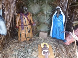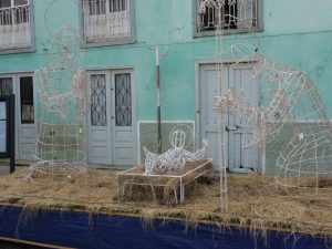 Afrika: Die Draht-Krippe vor dem türkisfarbenen Haus im Kolonialstil stand auf einem Kirchenvorplatz auf São Nicolau (dt.: „Sankt Nikolaus“) auf den Kapverdischen Inseln. Leider konnten wir tagsüber nicht sehen, wie sie am Abend beleuchtet aussah. Die Krippe mit dem dreieckigen Stall direkt vor dem Altar war im gleichen Ort in der Kirche. Auch hier war das Jesuskind – ebenso wie in Kambodscha – um ein Vielfaches größer als die restlichen Figuren.