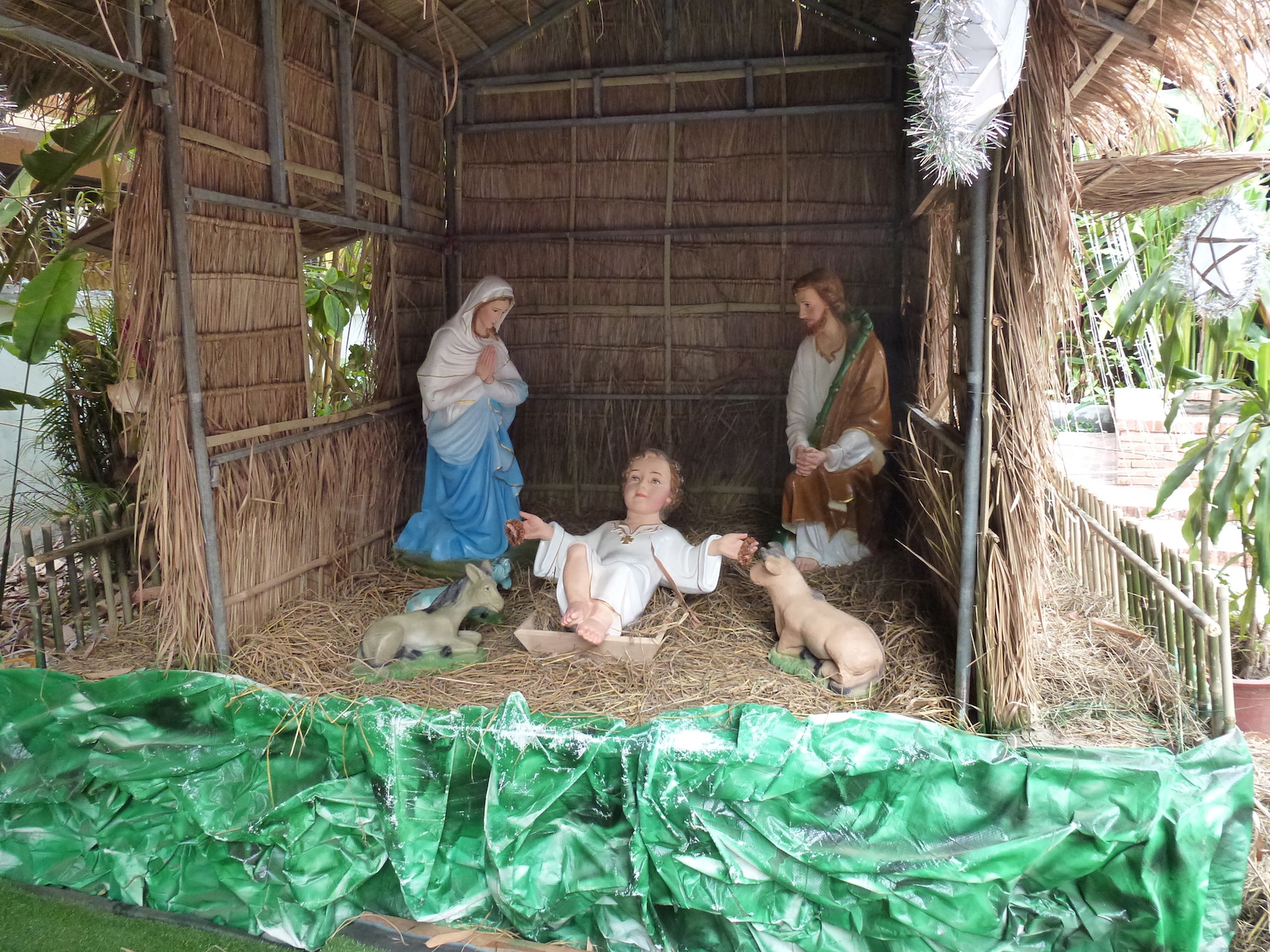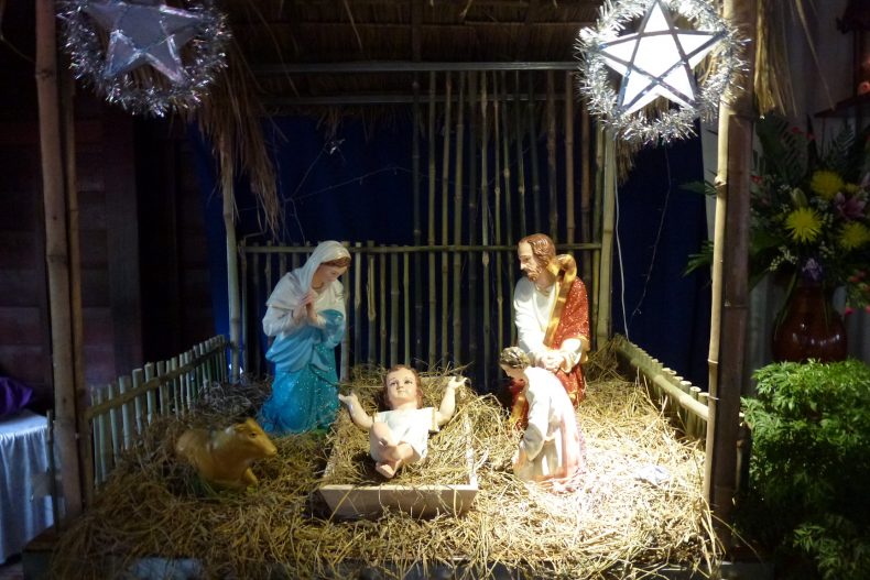 Asien/Kambodscha: Die stimmungsvolle Weihnachtskrippe oben stammt aus Kambodscha. Wir haben sie in einer katholischen Kirche in Siem Reap entdeckt. Die große, aus Palmenblättern gebaute Krippe befand sich vor dieser Kirche in einem Hof. Für uns auffällig bei beiden Krippen: Das Jesuskind ist deutlich größer als die übrigen Krippenfiguren.