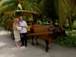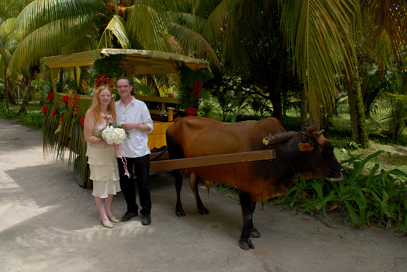 Auf La Digue angekommen, wurden wir von unserem Traumzeugen mit einem geschmückten Ochsenkarren abgeholt und zu unserem Hochzeitsstrand gefahren. Auf La Digue gibt es regulär keinen Autoverkehr, sondern nur Ochsenkarren und Fahrräder. Alles sehr relaxt. Die Insel ist so klein, dass man kein Auto braucht. Nach der Trauung hatten wir uns dann Fahrräder gemietet und den Tag ganz entspannt bei einer Rundtour über die Insel genossen. Ein absoluter Traum!