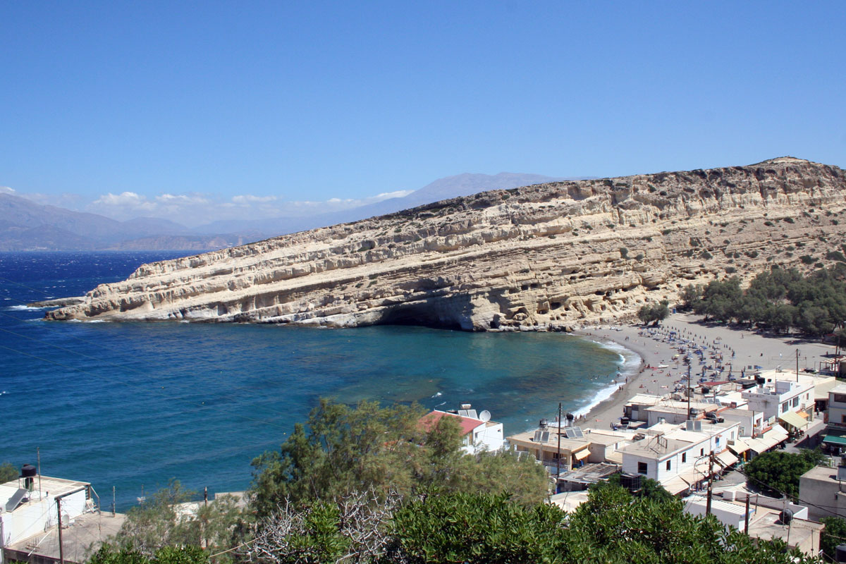 Matala ist ein kleines Dorf an der Südküste von Kreta und gehört zur Ortschaft Pitsidia im Bezirk Tymbaki der Gemeinde Festos. Bekannt wurde Matala vor allem durch die Hippiebewegung in den 1960er/70er Jahren. Damals siedelten Hippies aus aller Welt in den neolithischen Wohnhöhlen, die in der Bucht direkt am Meer liegen. Die Höhlen aus der Jungsteinzeit dienten während der römischen Besatzungszeit als Grabstätten und sind noch immer die berühmteste Attraktion von Matala. Wohnen darf dort heute allerdings niemand mehr. Aber auch ohne die Hippies von damals hat der Ort noch immer ein gewisses Flair. Vor allem, wenn am Abend die Touristenbusse wieder fort sind. Außerdem ist Matala ein sehr guter Standort für Ausflüge in alle Richtungen, da es relativ mittig in der Ausrichtung von Westen nach Osten liegt. Stefan und ich haben uns für mehrere Tage ein Auto gemietet und konnten so einiges von der Schönheit Kretas entdecken – z B. die Lasithi-Hochebene (oder auch Lassithi-Hochebene) auf durchschnittlich 830 Metern Höhe, die geschichtsträchtigen Hafenstädte Rethymno (veraltet auch Rethymnon) im Norden, Agios Nikolaos im Osten und Ierapetra im Südosten sowie die Ruinen der antiken Stadt Gortyn (auch Gortys oder Gortyna), um nur einige der vielen Höhepunkte unserer Reise zu nennen.