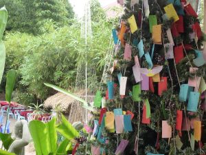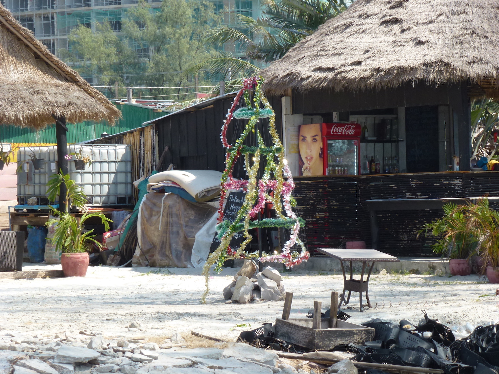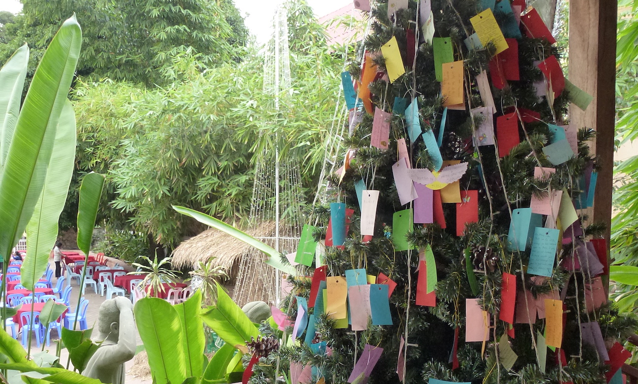 Asien/Kambodscha: Gut gefallen hat uns die Idee mit dem Prayer’s tree bzw. Wunschbaum, den wir per Zufall an einer kleinen katholischen Kirche in Siem Reap gefunden haben. Neben den vielen buddhistischen Tempeln überall waren wir ganz überrascht, plötzlich eine christliche Kirche zu entdecken. Der etwas zerrupft aussehende Girlandenbaum stand neben einer Strandbar in Otres und der rote Kunststoff-Nikolausbaum mit den kleinen Leucht-Schneemännern drum herum in sengender Hitze in Sihanoukville.