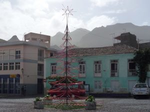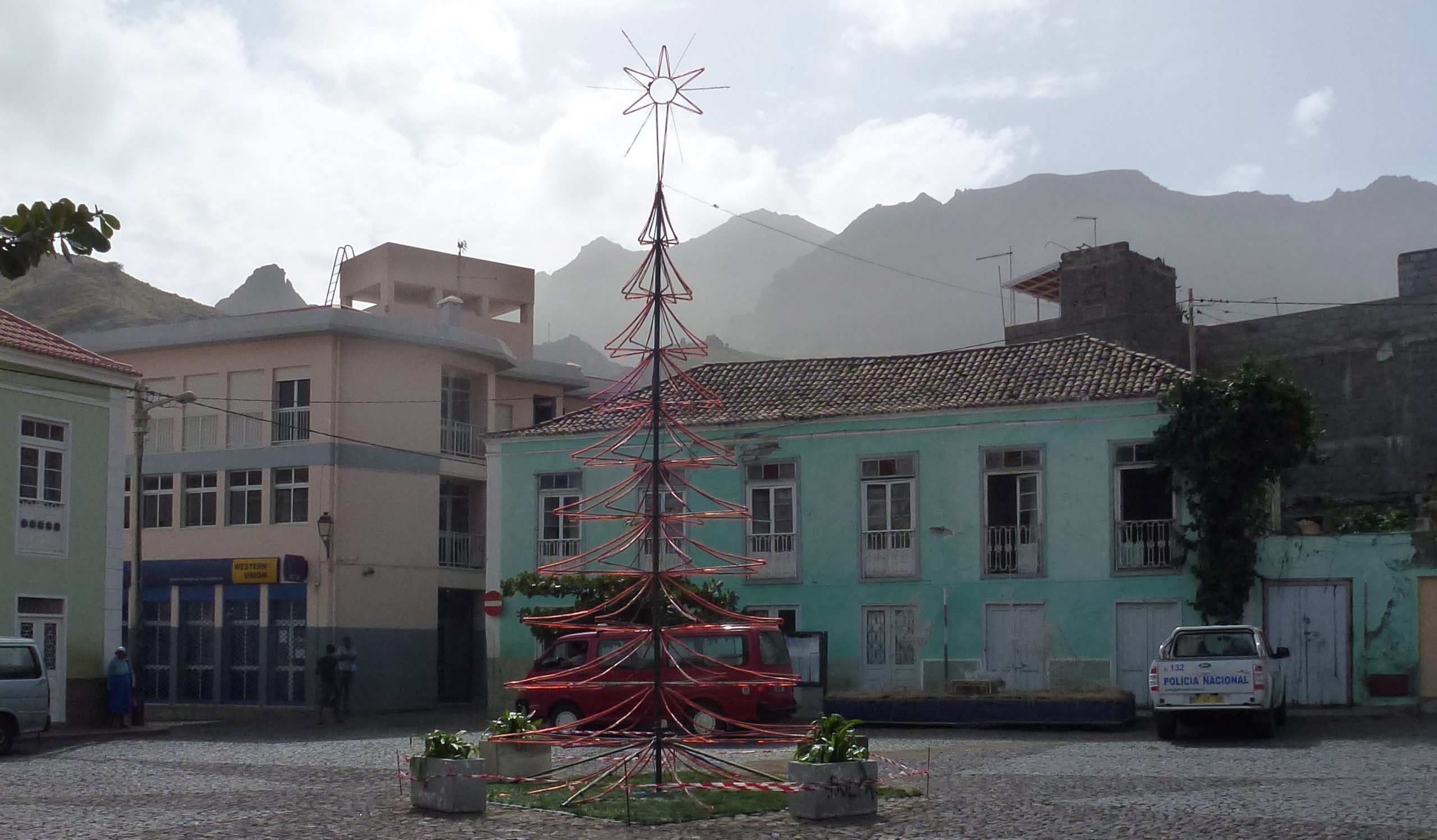 Afrika/Kapverden: Den Draht-Weihnachtsbaum vor dem türkisfarbenen Haus im Kolonialstil haben wir auf São Nicolau (dt.: „Sankt Nikolaus“) auf den Kapverdischen Inseln entdeckt. Da wir an dem Ort nur tagsüber waren, konnten wir leider nicht sehen, wie er beleuchtet aussieht.